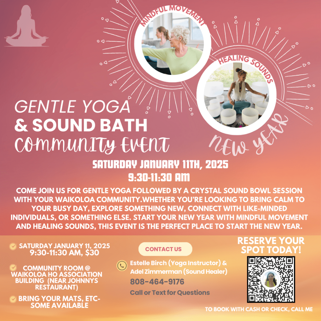 Join us for a Gentle Yoga & Sound Bath Community Event on Saturday, January 11, 2025 from 9:30 – 11:30 AM at the Waikoloa Community Room (near Johnnyโs Restaurant).